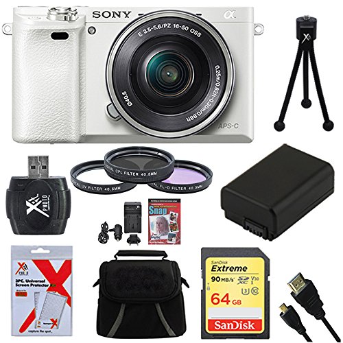 Sony Alpha a6000 White Camera with 16-50mm Power Zoom Lens 64GB Kit – Includes Camera with Lens, Memory Card, Carrying Case, Filter Kit, Battery, Battery Charger, Card Reader, Mini Tripod, and More