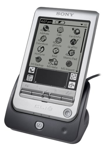 What’s in the box: Clie handheld, USB HotSync cradle, AC adapter, Stylus, Protective cover, Installation CD-ROM, Application manual, Graffiti sticker