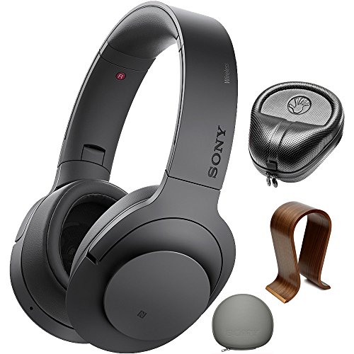Sony Wireless Noise Canceling Bluetooth Headphones Charcoal Black (MDR100ABN/B) with Slappa HardBody PRO Full Sized Headphone Case Black & Universal Wood Headphone Stand