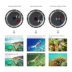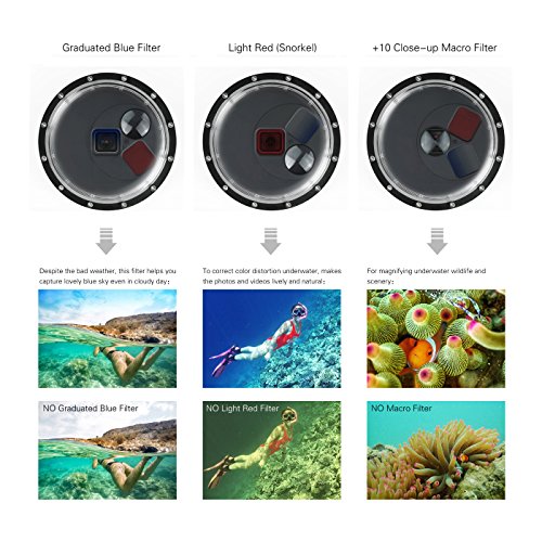 3 Filters Switchable Design: Inbuilt +10 Close-up Macro Filter, Red Filter and Graduated Blue Filter, strongly make stronger your shooting experience under different situations. Simply swivel the rotary knob to switch filters: Macro Filter for capturing tiny underwater wildlife; Red Filter for vivid and natural underwater scenery; Graduated Blue Filter for blue sky.