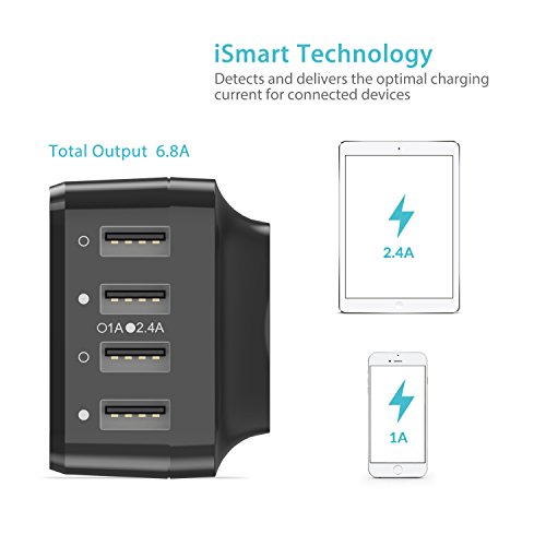Full-Speed Charging: 4 Ports (2×2.4A + 2×1A) could max up to a 34W/6.8A output, available for charging four devices simultaneously