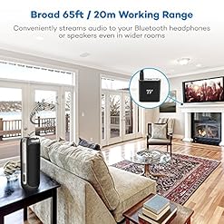 Broad 65ft / 20m Working Range: Bluetooth transmitter conveniently streams audio to your Bluetooth headphones or speakers at double the distance than similar devices(This transmitter can NOT pair with any phones or tablets).