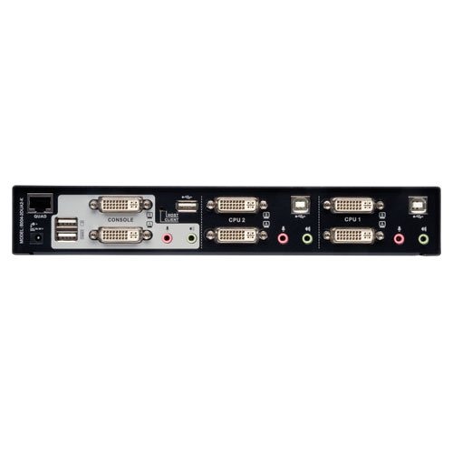 Quad-View Mode allows computers with three- or four-head video cards to share KVM, audio and USB peripherals by connecting two Dual Display KVM switches together