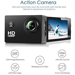 Capture your most amazing action moments in full 1080P with waterproof action camera. 170-degree wide-angle lens allow you to capture it all in stunning HD. 1.5-inch HD LCD display, 1080P / 30fps, 720P / 60fps video and 12 megapixel pictures, F2.0 aperture.