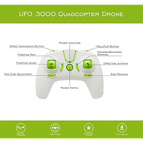 Vibrant LED Drone Quadcopter – Emits an extra bright neon blue and green light all over the place the UFO 3000 to be able to fly even in the darkest terrain.
