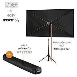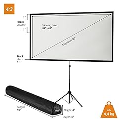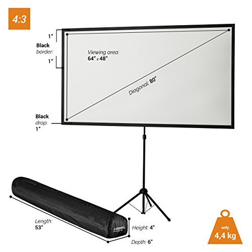 This projector screen has a viewing area of 64” x 48”, or 80” diagonal. It has a 4:3 aspect ratio and is provided with a black carry case to protect it whilst being transported and stored.