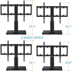 ADJUSTABLE TELEVISION HOLDER STAND: Comes with 4 sets of hole in different height, this stand may also be adjusted to 4 levels of heights-22.56″, 24.13″, 25.7″ and 27.28″(from the bottom to the highest point of the bars); This TV stand may also be swiveled from -20°to +20°