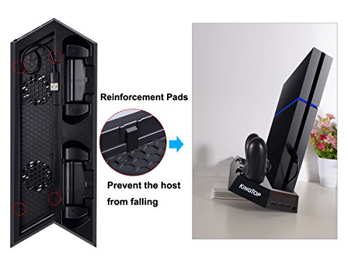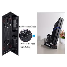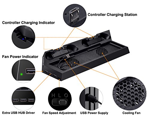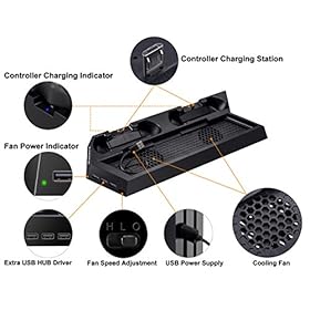 Universal PS4 Console Vertical Stand Fan Cooler keep your PS4/PS4 PRO/PS4 Slim cool and calm with the vertical cooling stand; Dual Charging station with 2 charger ports to charge both of your PS4 shock controllers concurrently, saving your time when want to charge the controllers; 2 HUB and 1 USB ports with powerful output for data transferring and charging.