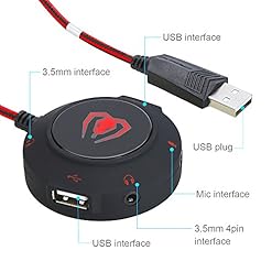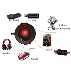 USB hub function : two USB ports, two 3.5mm audio compatible 7.1gaming headset ports, mouse + keyboard + notebook radiator + USB fan + Video + 3.55 Jack microphone + earphone and microphone + U disk + other commonly used USB devices and 3.55mm audio devices. Play the game with no obstacle