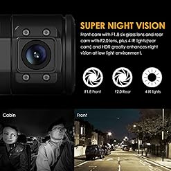 Infrared Night Vision: F2.0 6-glass lens rear facing cam plus 4 IR LED lights greatly enhances night vision in car at low light environment, making your driving more safer at night. F1.8 6-glass lens front facing cam and unique HDR video system routinely balance the light and dark areas of the video. Simply toggle the night vision status by pressing the power button.