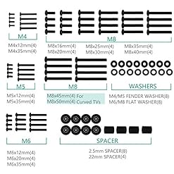 This product is a whole bag of screws with washers and spacers. It includes M4, M5, M6, and M8 TV screws and spacers which can meet more than a few mounting requirements and work for all TVs up to 80″. Our hardware kit used to be designed to maximize compatibility between all types and brands of TV such as Samsung curved TVs. It is extremely convenient to attach your TV to the mount or wall by the use of these screws. Package includes: M4 screws-12mm/0.47 inches/ 4 pieces; M4 screws– 35mm/1.38 inches/ 4 pieces; M5 screws– 12mm/0.47 inches/ 4 pieces; M5 screws– 35mm/1.38 inches/ 4 pieces; M6 screws-12mm/0.47 inches/ 4 pieces; M6 screws –20mm/0.79 inches 4 pieces; M6 screws — 35mm /1.38 inches/ 4 pieces; M8 screws — 16mm/0.63 inches/ 4 pieces; M8 screws — 20mm/0.79 inches /4 pieces; M8 screws — 25mm/0.98 inches /4 pieces; M8 screws — 30mm/1.18 inches /4 pieces; M8 screws — 35mm /1.38 inches /4 pieces; M8 screws — 40mm/1.57inches /4 pieces; M8 screws — 45mm/1.77inches /4 pieces/ essential for Samsung curved TVs; M8 screws– 50mm/1.97inches /4 pieces/ essential for Samsung curved TVs; M4/M5 washers/ 8 pieces; M6/M8 washers/ 8 pieces; 2.5mm spacer/ 8 pieces; 22mm spacers/ 4 pieces.