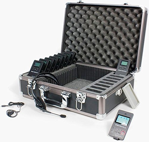 One-way, wireless tour guide system within the 2.4 GHz band. Ideal for smaller tour groups of 10 or fewer members. Enhances communication between tour guide and group members. Helps overcome background noise and distance from the tour guide. The system can be utilized in factories, museums, tourist attractions, or bus tours. Group members have listen-only capabilities.