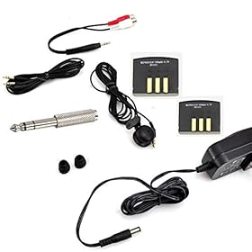 Purchase Includes: 1 Transmitter/Charging Base, 1 AC adapter, 1 Headset, 2 Rechargeable Batteries, 2 Pairs of earbuds, RCA Adapter Cable, Auxiliary Cable (3.5mm), 6.3mm to 3.5mm Adapter and an External Microphone,One year warranty!