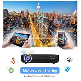 【Multi-screen Sharing】: Smartphone resources can be shared through the large 180″ screen by Airplay/Miracast/DLNA. Ushare App also works, which developed by WOWOTO. While the connectivity options allow H8 Projector to be used with tablets, notebooks, smartphone and PC, your business life will be convenient and professional.