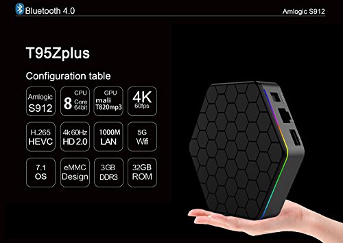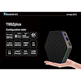 T95Z Plus Android TV Box: equipped with Amlogic S912 Octa-core ARM Cortex-A53 CPU up to 2.0Ghz which is the most professional Octa Core CPU performance for networking Android box and Mali-T820MP3 GPU up to 750MHz.