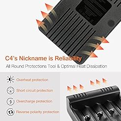 UNIVERSAL CHARGER: It can charge simultaneously rechargeable batteries of different specifications (18650, 26650, 26500, 22650, 18490, 17670, 17500, 17355, 16340, 14500, 10440, A, AA, AAA, SC sizes).