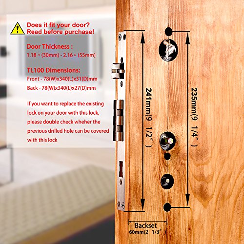 FIT DOORS:Backset 2.36〃(60mm),Door thickness between 1.38〃(30mm) and 2.16〃(55mm),We suggest ask Locksmith to install this lock.Installation Video :Search ZKTeco TL100 on YouTube