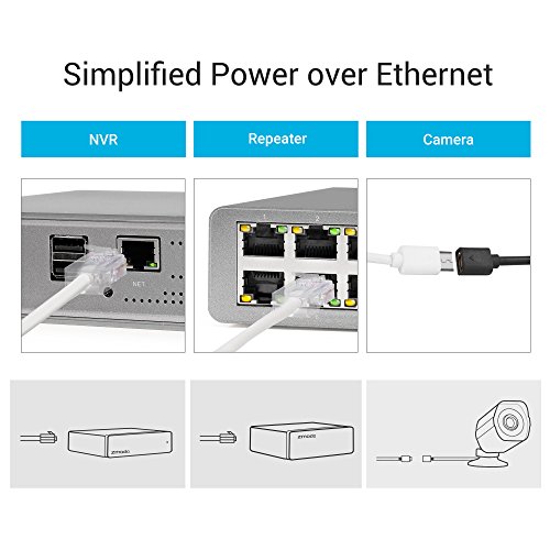 【Simplified PoE】- Simplified Power over Ethernet means the IP cameras connect to the NVR with a single cable that transmits both data and power, allowing for an easy installation and setup. Repeater fits your flexible installation need. 8 Channel NVR gives you choices to add up to 4 more wired or wireless Zmodo Cameras